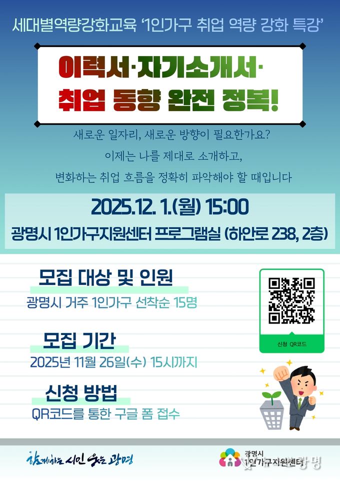 모집 대상은 광명시에 거주하는 1인가구 15명이며, 취업을 준비하거나 경력 전환을 고려하는 누구나 신청할 수 있다. 접수는 QR코드 또는 구글폼을 통해 11월 26일(수) 15시까지 진행된다.