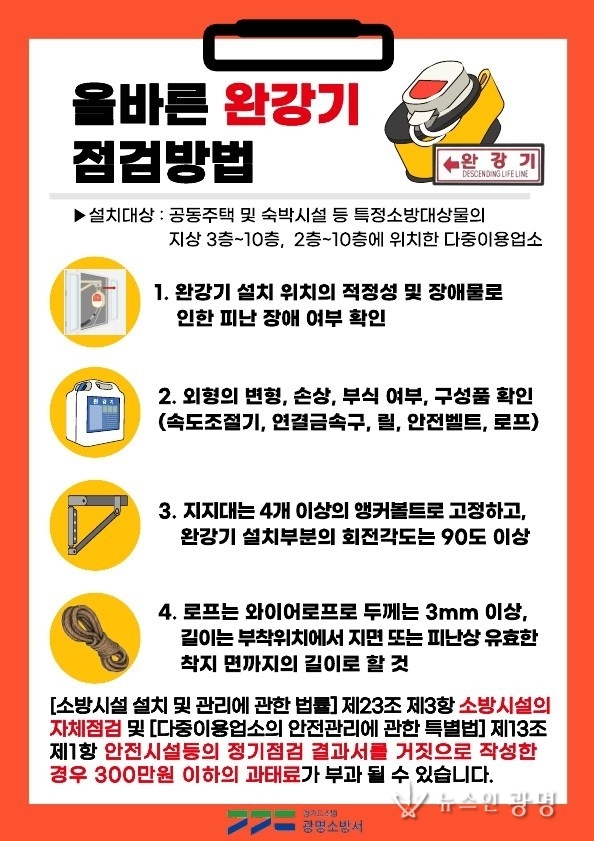 유해공 광명소방서장은 “완강기는 단순한 설치시설이 아니라 실제 위기 상황에서 생명을 지키는 중요한 피난장비”라며 “지속적인 교육과 관리체계 구축을 통해 시민 안전 확보에 최선을 다하겠다”고 밝혔다.
