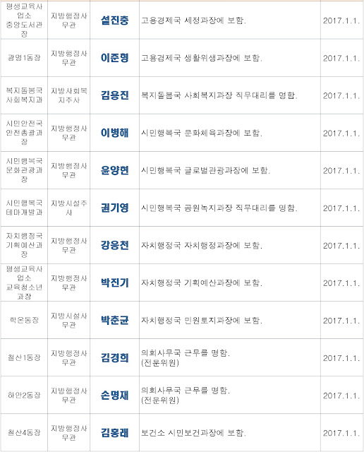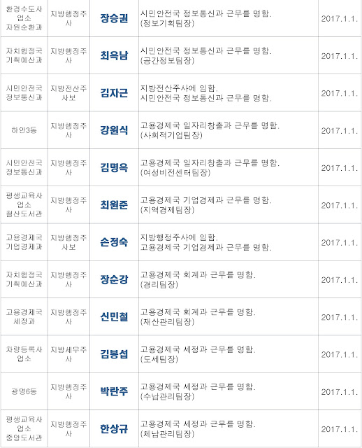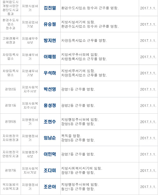 광명시는 2017년 1월 중 인사에서 국장 승진에 테마개발과 최봉섭, 일자리창출과 박충서, 자치행정과 최동석, 기업경제과 신세희 과장을 국장으로 승진하였다.