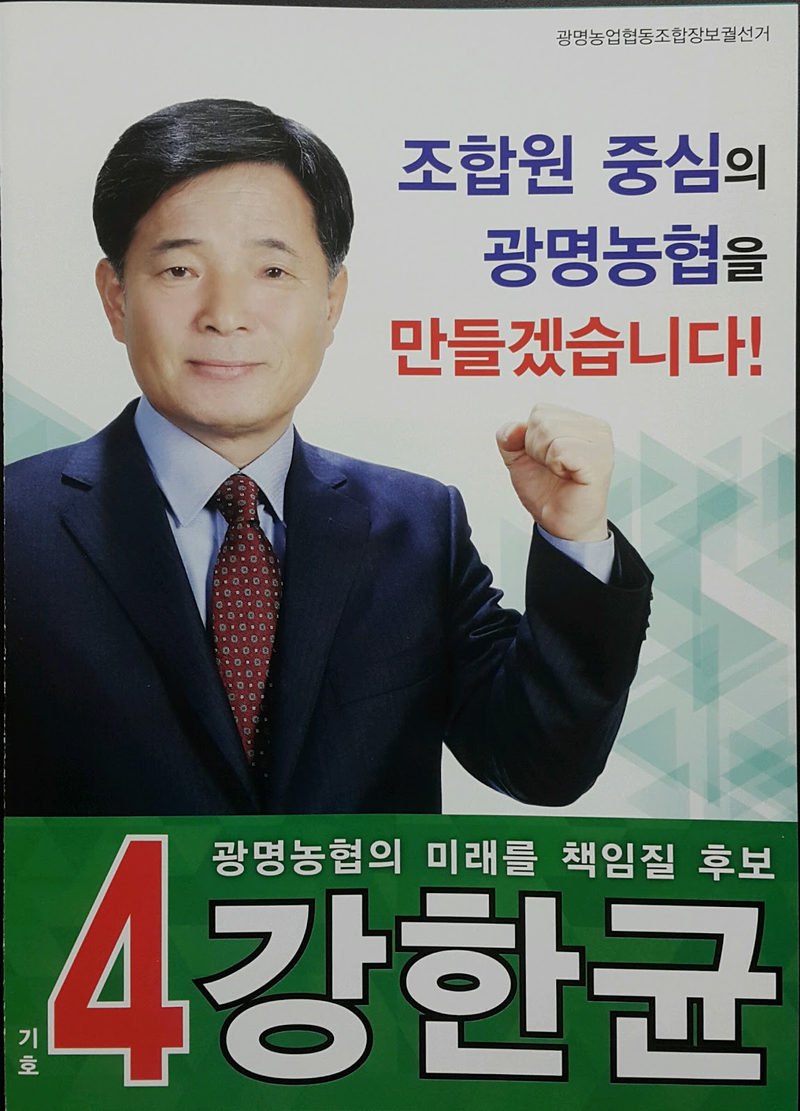 조합원을 위한 환원사업을 하고, 조합원 중심의 광명농협을 만들겠습니다. 광명농협이 10여 년 동안 내부적 갈등으로 답보 상태였는데, 첨단 산업단지와 유통단지가 들어오는 급변하는 시기, 광명농협의 제2의 전성기를 만들겠습니다.