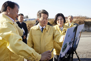 28일 안성에서 19번째 민생경제 현장투어에 나선 김동연 경기도지사가 경기도 최남단 안성의 거점소독시설을 찾아 초동 방역 상황을 긴급 점검했다. 이번 점검은 지난 25일 충남 당진에서 발생한 아프리카돼지열병에 대한 선제적 방역 조치의 하나로 마련됐다. 김 지사는 현장에서 터널식 소독조에서 진행되는 가축 방역 과정을 지켜본 후 관계자들을 격려하고 겨울철 동물방역에 최선을 다해줄 것을 당부했다. 김 지사는 “조류인플루엔자와 아프리카돼지열병이 계속 전파 중이어서 걱정이다. 경기도는 빠른 대응, 강력한 방역, 신속한 지원의 3대 원칙으로 동물방역에 대처하겠다”며 “축산농가 보호와 축산업 발전을 위해 최선을 다하겠다. 축산농가 종사자 여러분들도 방역과 예방에 협조를 부탁드린다”고 강조했다. 돼지 33만 두를 사육하는 안성(도내 2위, 전국 4위)은 평택·화성과 근접한 돼지 사육 중심지다. 경기도는 방역대 설정, 이동 제한 등 광범위한 방역 조치를 시행하고 있다. ■ 현장에서 김보라 안성시장, 윤종군 국회의원과 즉석 스탠딩 간담회 가져 소독시설 점검을 마친 김동연 지사는 28일 하루 동안 현대차그룹 미래 모빌리티 안성 배터리 연구소 투자유치, 안성 동신일반산단 간담회