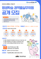 광명시(시장 박승원)가 시민 주도의 생활권 중심 평생학습 정책을 강화하기 위해 ‘제4기 평생학습 권역별실무위원회’ 신규 위원 100명을 공개 모집한다. 평생학습 권역별실무위원회는 마을 단위의 학습 의제를 발굴하고 현장 맞춤형 프로그램을 기획·운영하는 민관 협력 기구다. 위원회는 ▲으뜸터(광명1~3동) ▲다울마을(광명4~7동) ▲철산지기(철산1~4동) ▲하안처럼(하안1~4동) ▲예터지기(소하·일직·학온동) 등 5개 권역으로 구성된다. 지원 자격은 광명시에 주민등록이 되어 있는 만 19세 이상 시민이라면 누구나 가능하며, 해당 권역 소재 사업장이나 기관·단체 근무자도 신청할 수 있다. 선발된 위원은 4월 1일부터 2년간 ▲마을 평생학습 의제 발굴 및 사업 제안 ▲마을배움터 프로그램 기획 및 운영 ▲평생학습축제 기획·참여 등 지역 학습 생태계 조성을 위한 핵심 역할을 수행하게 된다. 모집 기간은 오는 2월 19일부터 2월 27일까지다. 접수는 이메일(shk3701@korea.kr) 또는 광명시 평생학습원 방문을 통해 가능하다. 시는 3월 중 서류심사와 면접을 거쳐 최종 위원을 선발하고, 3월 말 위촉식을 진행할 계획이다. 윤영희 평생학습원장은 “이번 제4기 위원회