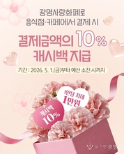 - 5월 1일부터 한 달간 관내 음식점·카페 결제 시 10% 즉시 환급 - 1인당 최대 1만 원… 가정의 달 가계 부담 덜고 골목상권 활력 기대 광명시가 5월 가정의 달을 맞아 가족 외식은 즐겁게, 골목상권은 활기차게 만드는 특별한 캐시백 혜택을 제공한다. 시는 오는 5월 1일부터 5월 한 달간 음식점·카페에서 광명사랑화폐로 결제하는 경우 결제 금액의 10%를 환급하는 ‘가족 외식비 캐시백 지원사업’을 추진한다고 28일 밝혔다. 이번 사업은 고물가 상황에서 외식 수요가 집중되는 가정의 달을 맞아 시민들의 가계 부담을 실질적으로 덜어주는 한편, 소비 침체로 어려움을 겪는 지역 소상공인을 돕기 위해 마련했다. 캐시백 혜택은 광명사랑화폐 가맹점 중 음식점과 카페에서 결제할 때 적용된다. 특히 지역화폐 사용처를 오는 8월 31일까지 고유가 피해지원금 기준에 맞춰 연매출 30억 원 이하 업체까지 한시적으로 확대하면서, 가족 외식비 캐시백 혜택을 받을 수 있는 가맹점 범위도 함께 넓어졌다. 결제액(인센티브, 정책수당 결제분 제외)의 10%를 1인당 최대 1만 원까지 광명사랑화폐로 즉시 환급받을 수 있으며, 준비된 예산이 소진하는 경우 조기 종료한다. 지급된 캐시백은 지
